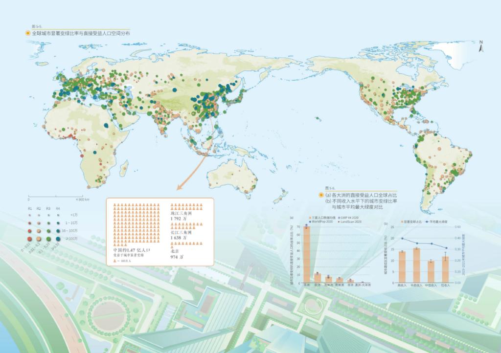 《全球大城市绿度变化与受益人口》案例对应SDG 可持续城市和社区,该成果基于全球开源卫星遥感数据,研制了2001-2021年城市绿度数据集,并定量评估了全球及我国城市绿度与城市变绿直接受益人口。分析表明,在全球1783个城市中,中国以全球19%的城市建成区面积贡献了全球28%的城市显著变绿区域,中国城市增绿受益人口占全球受益总人口约 47%。其中,珠江三角洲(1792万)、长江三角洲(1638万)和北京(974万)成为全球因城市显著变绿而受益人口最多的城市。