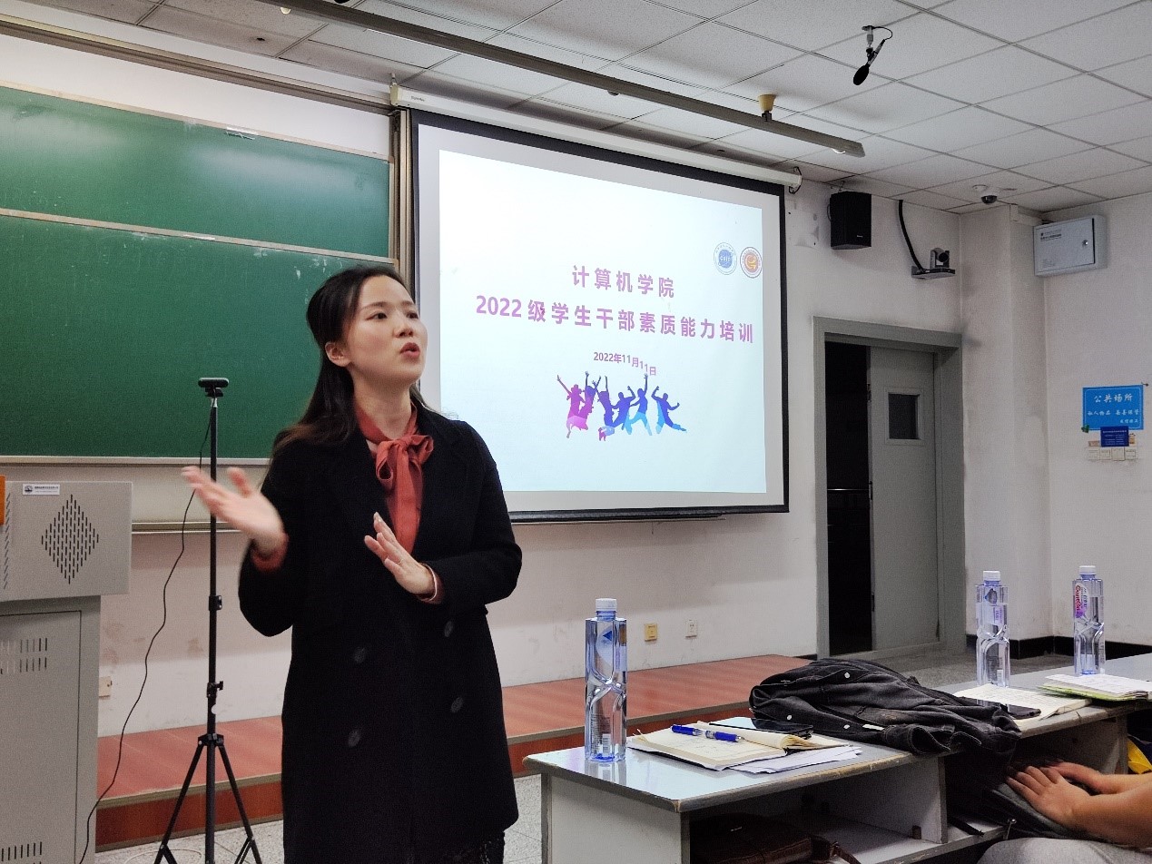 计科195班团支书曾欣,曾荣获学校“青春榜样十佳团支书”,她着重强调班委们要把握住大学一年级这个至关重要的时间段,个人发展方面要充分利用目前较为宽松的时间,充实自己的学习,积极参与竞赛和活动,提高课程成绩。在学生工作方面,班委要积极而又热情投入到班级党团活动的建设当中,制定好班级规章制度,提高班级凝聚力和绩点,并积极争取班级评优机会。接着她展示了自己所带的班级开展活动和获得荣誉情况,并提出“奋进、团结、友谊、有爱、坚持”这五个利于班级建设的关键词。同时,她还展示了计科195班精彩的校园生活记录视频,阐述班委记录班级生活点滴的重要性。