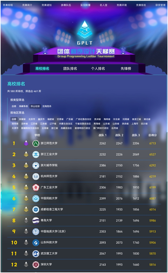“中国高校计算机大赛-团体程序设计天梯赛”是竞赛星级较高的四星级竞赛,比赛分设珠峰争鼎、华山论剑和沧海竞舟三个组别。本次比赛全国共有580所高校、1865支团队参赛,其中华山论剑组参赛高校为461所。本次比赛,William希尔派出的三支战队共获得了6014分的高分,排名位列全国第7名,四川省第1名。