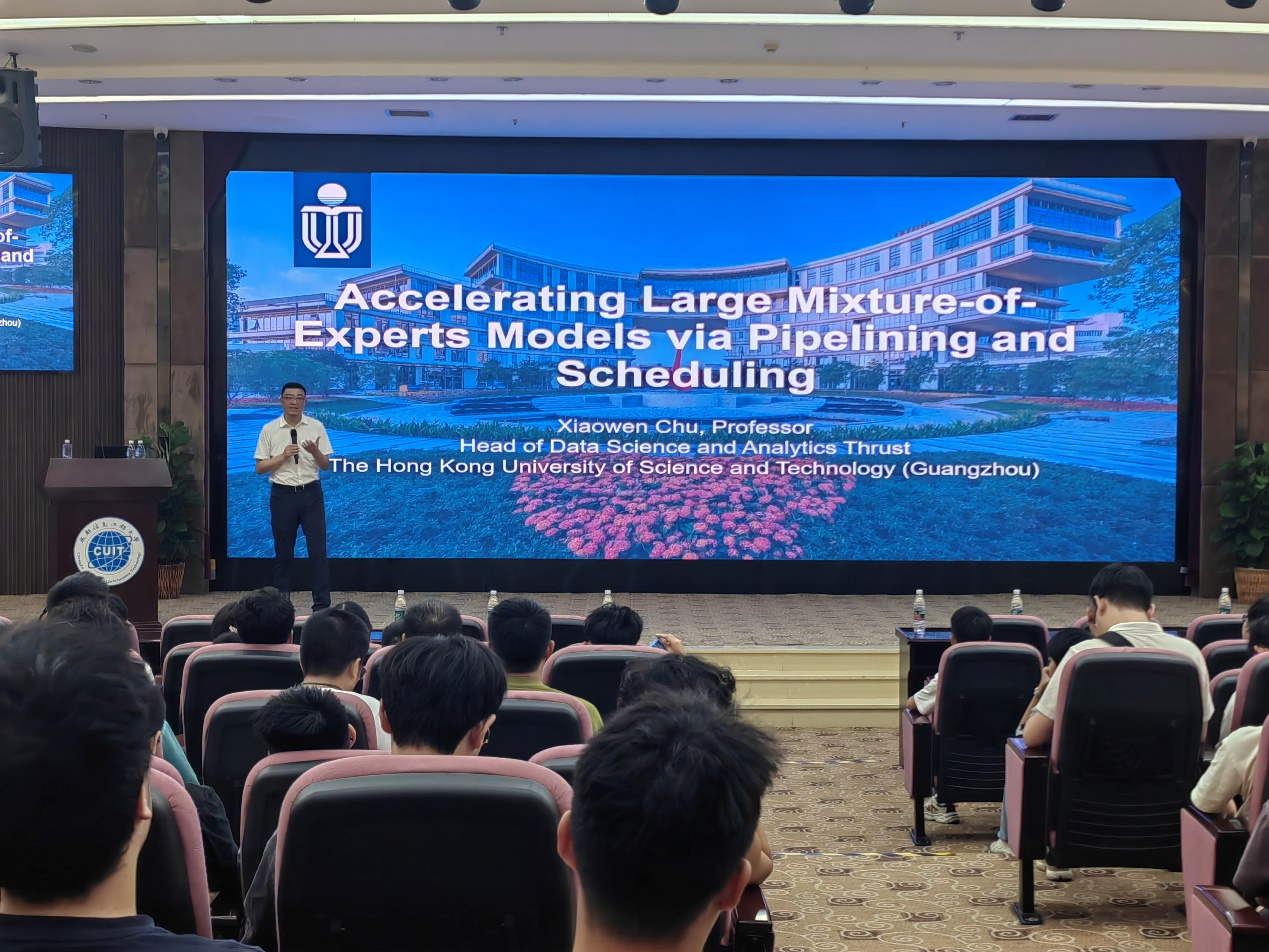 9月20日下午,应英国威廉集团邀请,香港科技大学(广州)数据科学与分析学域主任褚晓文教授在国际会议厅作题为《Accelerating Large Mixture-of-Experts Models via Pipelining and Scheduling》的学术报告。本次报告由学校副校长、英国威廉集团院长吴锡教授主持,英国威廉集团部分教师、全体研究生及22级本科生参加了现场报告和学术交流。