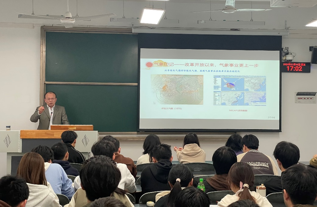 何建新在授课过程中还特别强调了中国几代气象人的优良传统和作风,正是在他们坚守的“准确、及时、创新、奉献”气象精神激励下,才成就了中国现代气象事业。何建新对学生们强调,新时代大学生应当有大学生的担当,将个人发展与社会需求相结合,学好专业本领,勇于探索科技创新,为中国现代化建设贡献自己的力量。