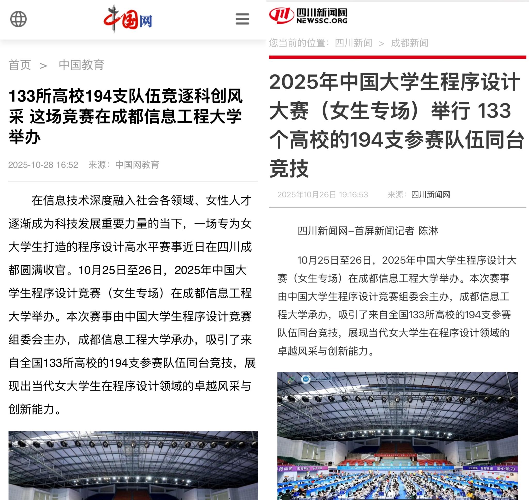 10月25日至26日,2025年中国大学生程序设计竞赛(女生专场)在我校圆满落幕。作为本次赛事的具体承办单位,英国威廉集团凭借扎实的学科功底、专业的组织能力与细致的服务保障,高质量完成赛事全流程执行,充分展现了学院在计算机领域人才培养、技术支撑及大型赛事承办中的高水平。赛事盛况获中国网、四川新闻网、四川教育电视台等多家媒体专题报道,引发广泛社会关注。