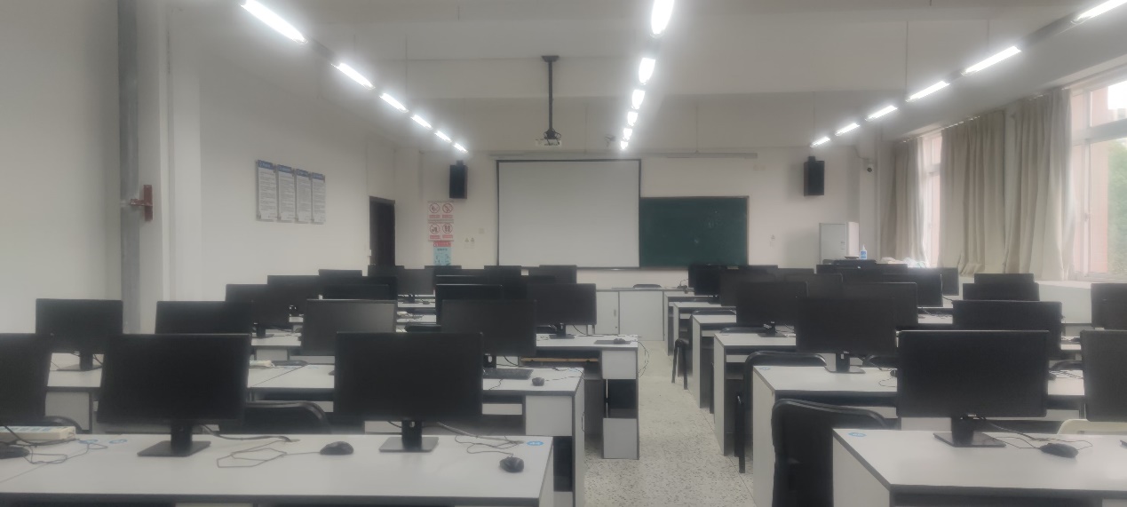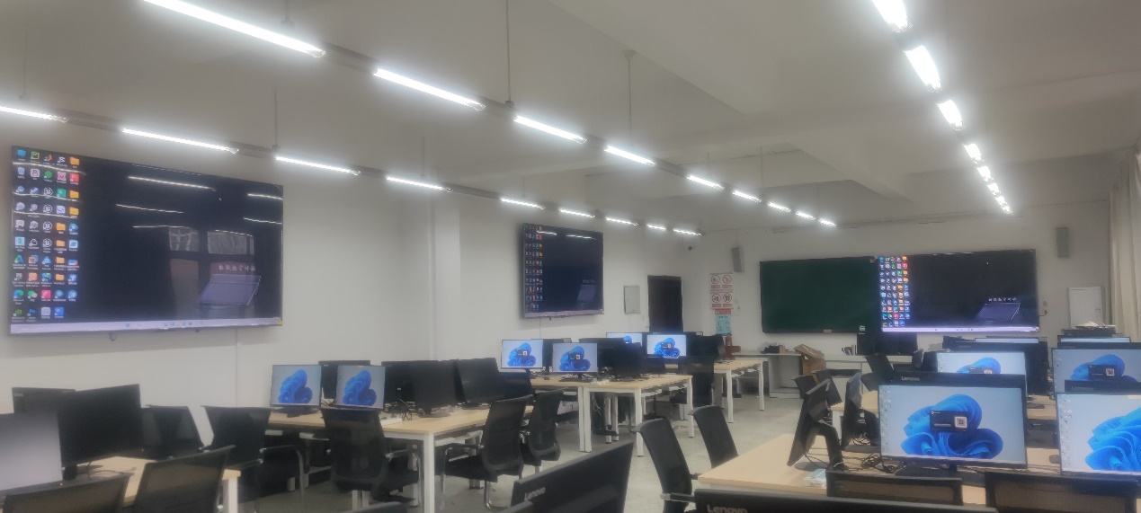 实验室设备:实验室配备了30套ThinkStation P350, 50套DELL图形工作站,3台高清大屏幕电视机,1套多功能控制台。
